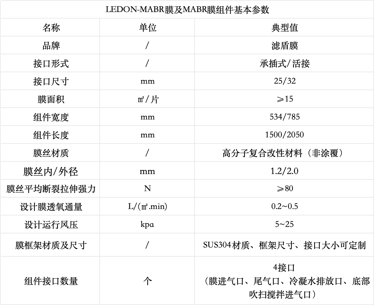 【LEDON MABR膜產品參數】